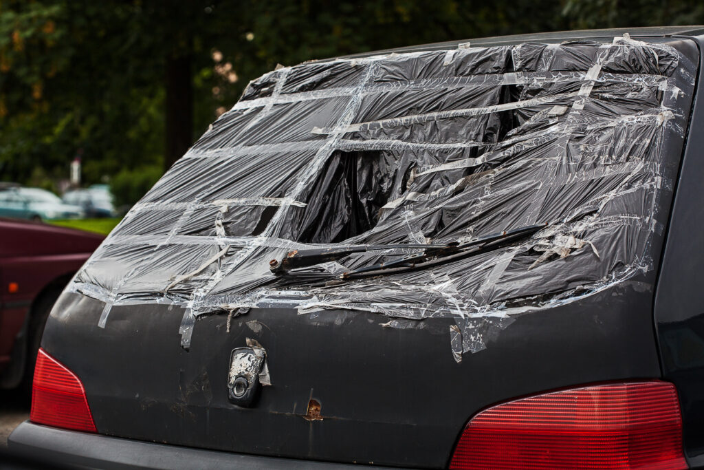 A closeup of a broken rear window of a small black car